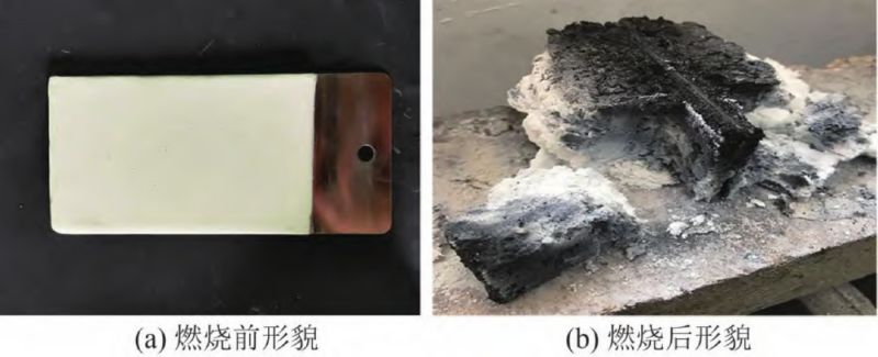 二氧化硅氣凝膠復合涂料通過利用二氧化硅氣凝膠不同的特性,并添加顏填料、助劑等使其具備不同的功能。圖4(a)是納米孔隙結構的二氧化硅氣凝膠粉體與耐高溫黏結劑體系復合制備而成的阻尼膠,將其涂覆于高速列車車體結構金屬板表面,如圖4(b)所示。當金屬板受到激發而產生彎曲振動時,其振動能迅速傳遞給緊密貼合的阻尼涂料,阻尼涂料通過內部相應錯動和摩擦,使振動能量變為熱能而損耗,起到減振降噪的作用。將二氧化硅氣凝膠分散在專用高性能樹脂乳液中可以制備水性涂料,其性能參數如下:熱導率 0. 031 W/(m·K),密度 120 kg/m3,阻燃性 V0 級,附著力 1. 2 MPa,憎水率不低于 98%。涂料被有效應用在高速列車車體上,可以達到結構減振降噪、隔熱和表面防護的目的,實現冬夏季隔熱保溫,降低空調能耗等作用。圖5 是鋼結構用氣凝膠防火涂料燃燒前后對比。此涂料厚度為3. 0 mm 時,耐火極限時間達2 h(一般防火涂料厚度需要3. 5 mm);與鋼板、鋁板等金屬材料附著力強,黏結強度大于1. 0 MPa;燃燒后金屬板材不變形、不燒蝕,被應用于高速列車的承重鋼結構件保護, 可有效阻止火勢失控蔓延。